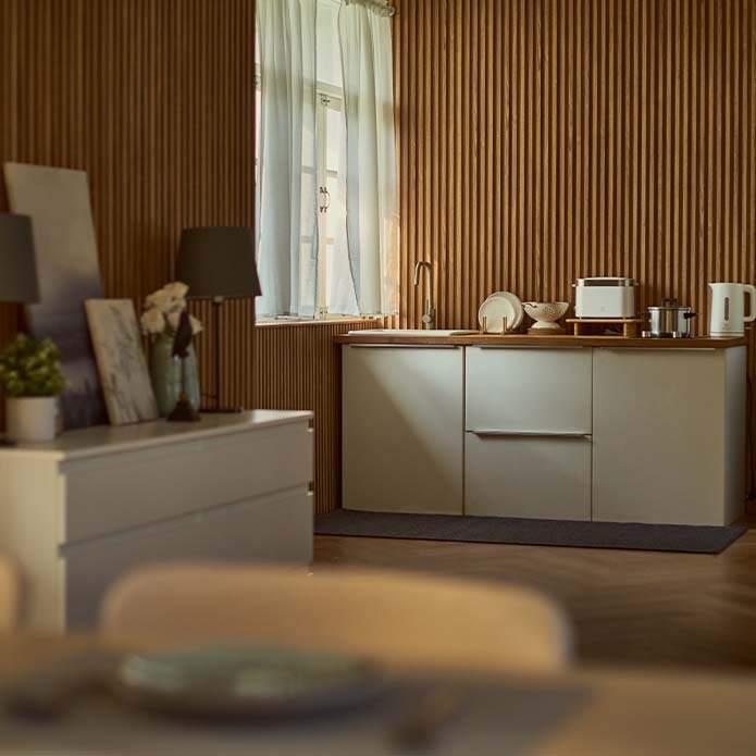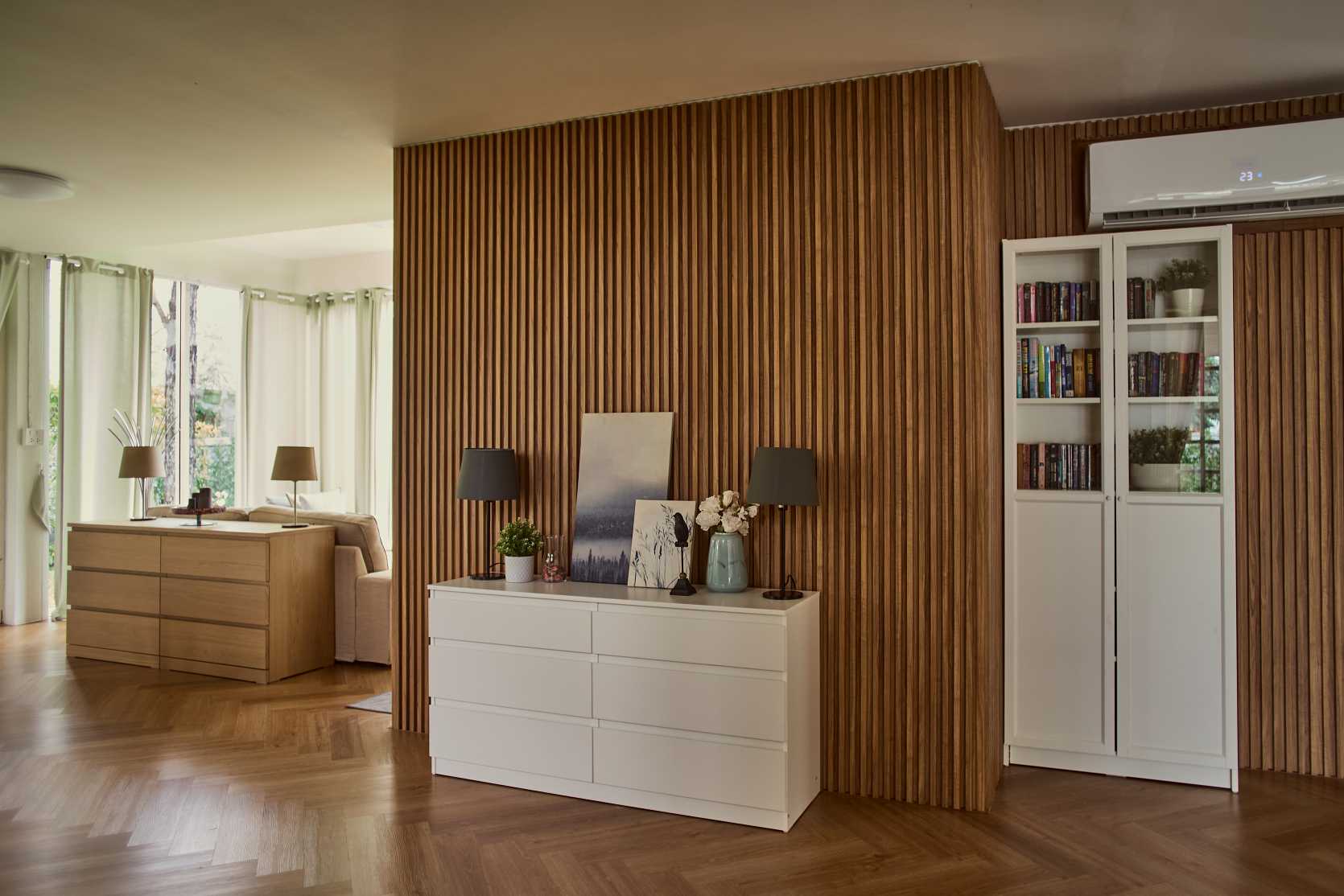 ด้วยรูปทรงที่น่ารัก และแปลกใหม่ ภายในบ้านจึงประกอบด้วยหลายลุคให้เลือกใช้ทั้งห้องขาวดำแบบนุ่มลึก หรือสีสัน Colorful แบบสนุกๆ อีกทั้งยังมีลูกเล่นที่ผนังเป็นtextureไม้ ถูกดัดแปลงให้มีครัว Built in ที่สามารถใช้งานได้จริงและที่สำคัญสามารถเคลื่อนย้ายครัวให้กลายเป็นผนังไม้โล่งๆได้